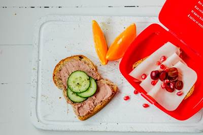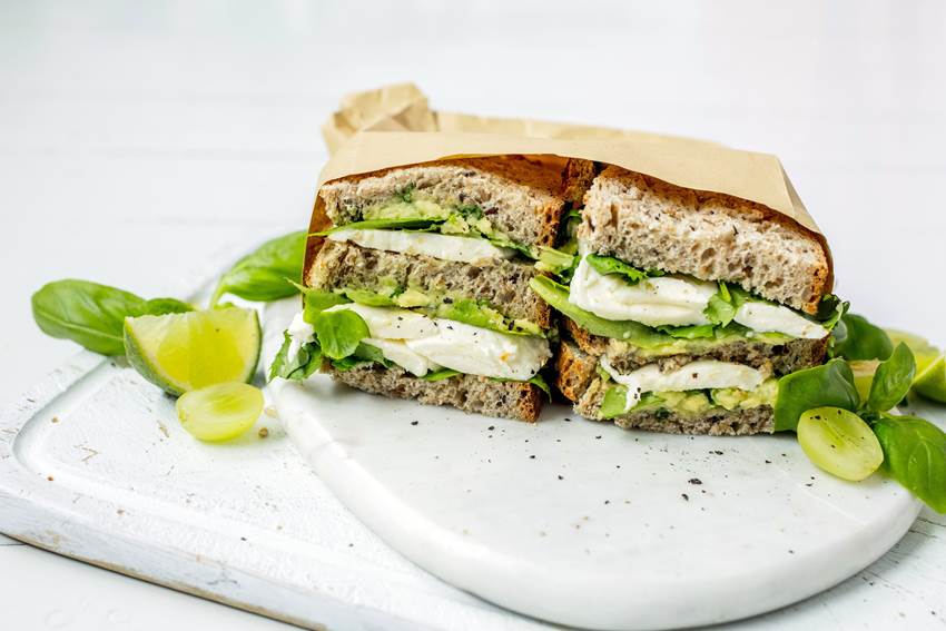 - Smør et lag med avokado på brødskiven, legg på salatblader, skiver av mozzarella og dryss over noen blader av de urtene du liker best.