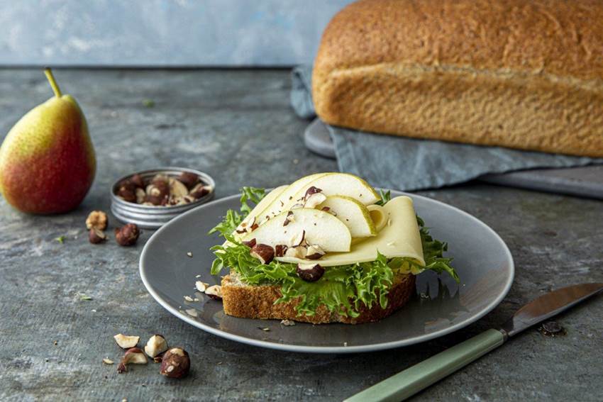 Sødmen i pære er en god match til ost. Om du liker nøtter, er denne brødskiven snart en favoritt!