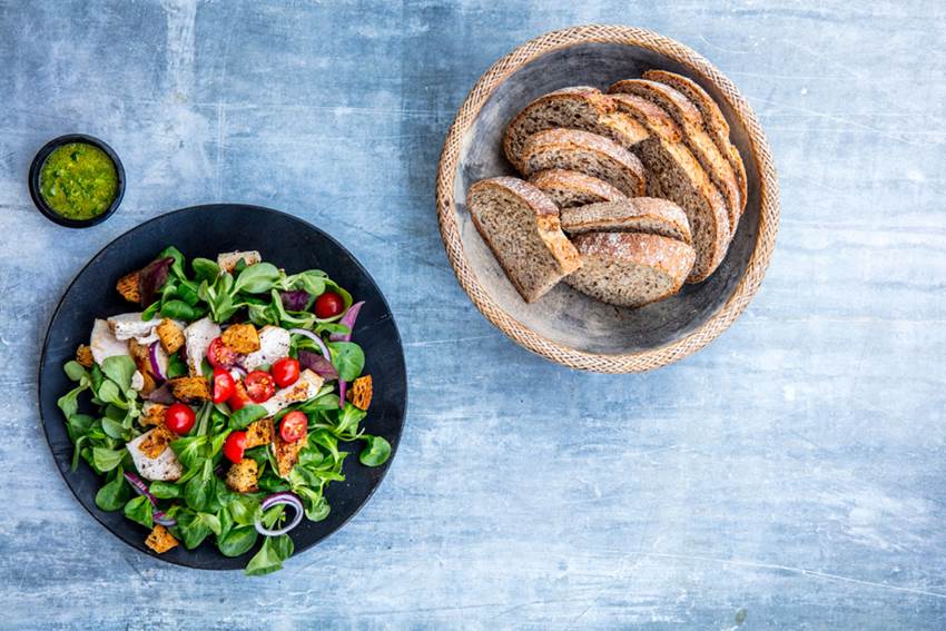 - Lag en salat ved å skjære tynne løkringer, dele cherrytomater i to og bland dette sammen med brødkrutonger. Oppskrift på brødkrutonger kan du se her.