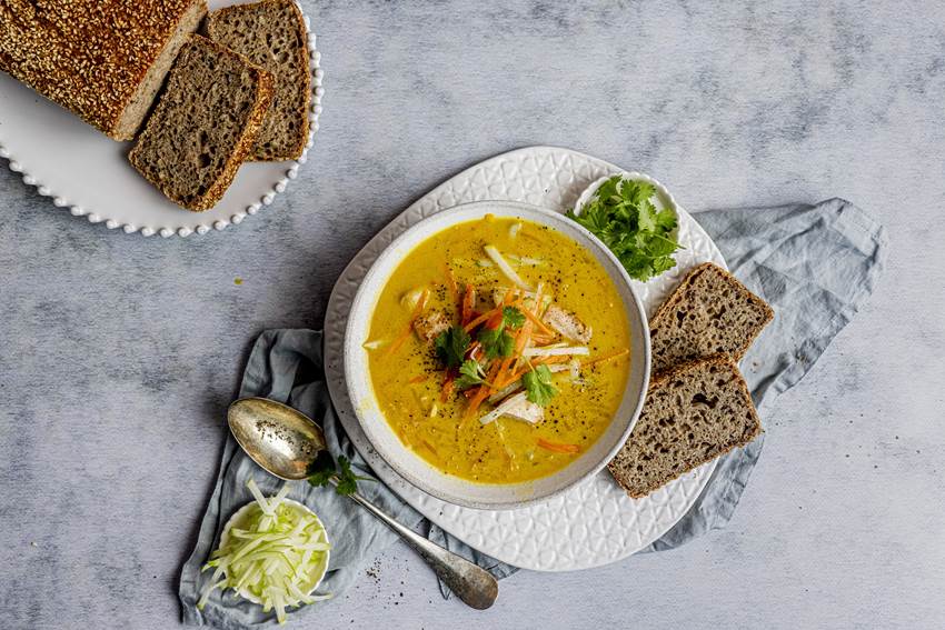 Indisk kyllingsuppe med speltbrød som tilbehør