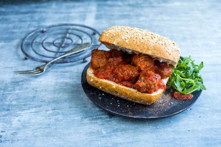 - Del rundstykket i to og fyll med kjøttboller og tomatsaus, og topp gjerne med ruccula. Enkelt, godt og mettende.