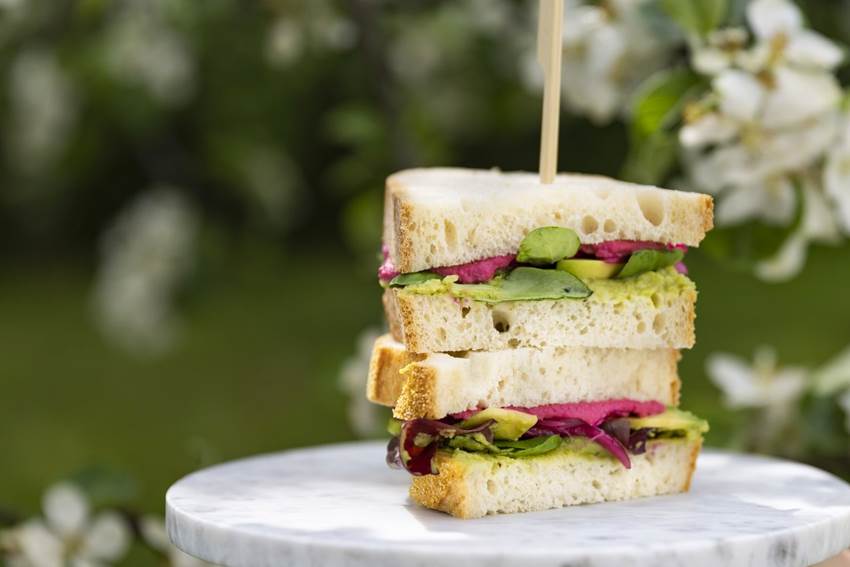 - Smør hummus på den andre skiven og legg på toppen. Del i to og server.