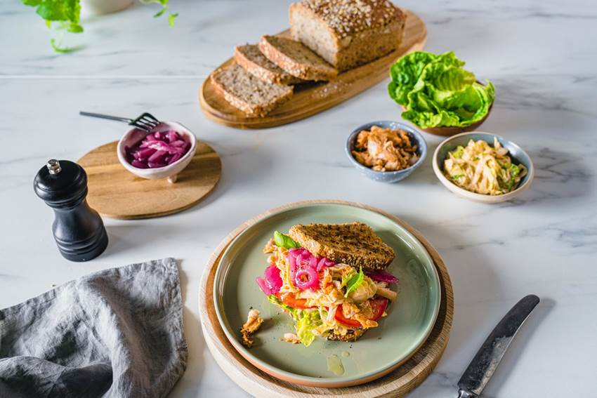 - Anrett sandwich med brødskiver, tomat, coleslaw, syltet rødløk og pulled kylling.