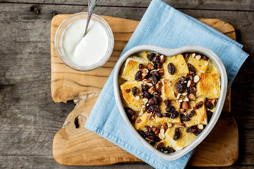 - Hell blandingen over brødet og la det stå og trekke i 30 min. Hell over mer melk om det virker tørt. Dryss over resten av mandlene og rosinenen.