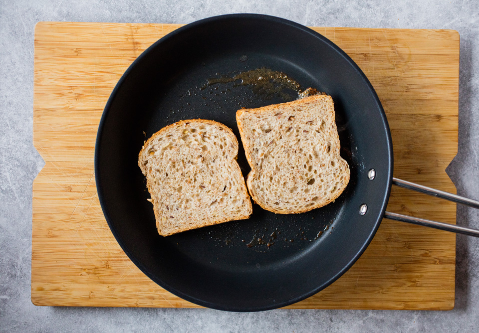 1. Stek brødskivene på én side, på middels varme med litt smør i pannen.