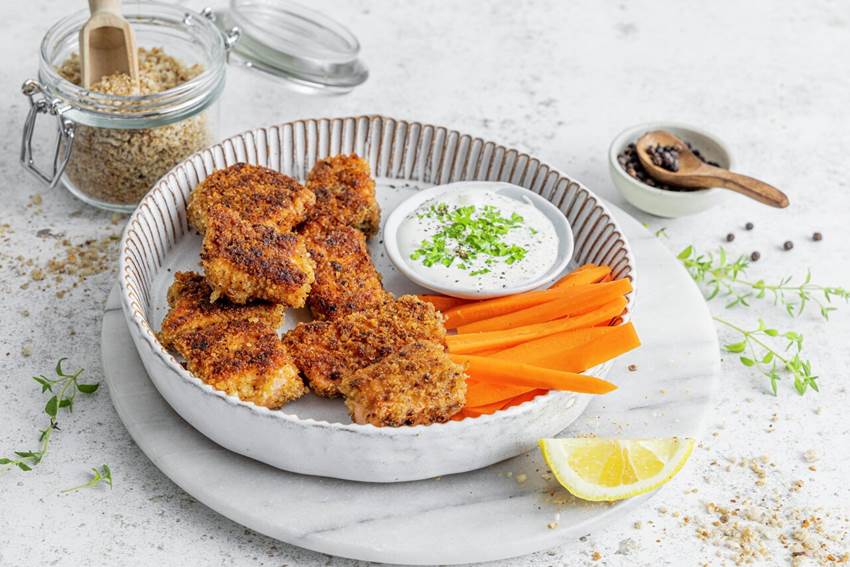 - Vend laksebitene først i egg, så i brødsmuler, slik at de er panerte på alle sider.