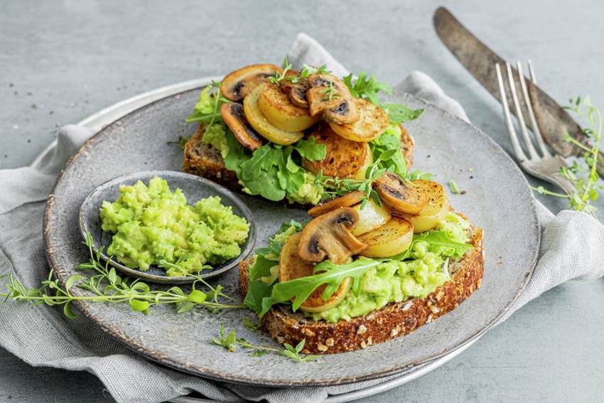 - Start med guacamole, forsett med salat og topp med lune poteter og sopp.