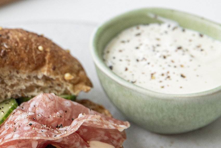- Bland hvitløk, rømme og majones og sett i kjøleskapet. Smak til med salt og pepper.