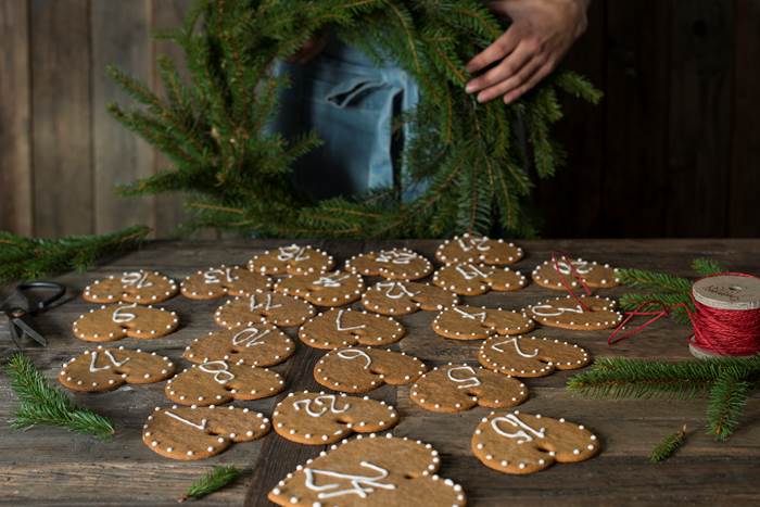 - Stikk ut pepperkakedeigen med hjerteformer. Lag hull i hjertene før steking slik at du kan feste pepperkakene til kransen - med tråd. Dekorer alle hjertene med melis i tallene 1 - 24.