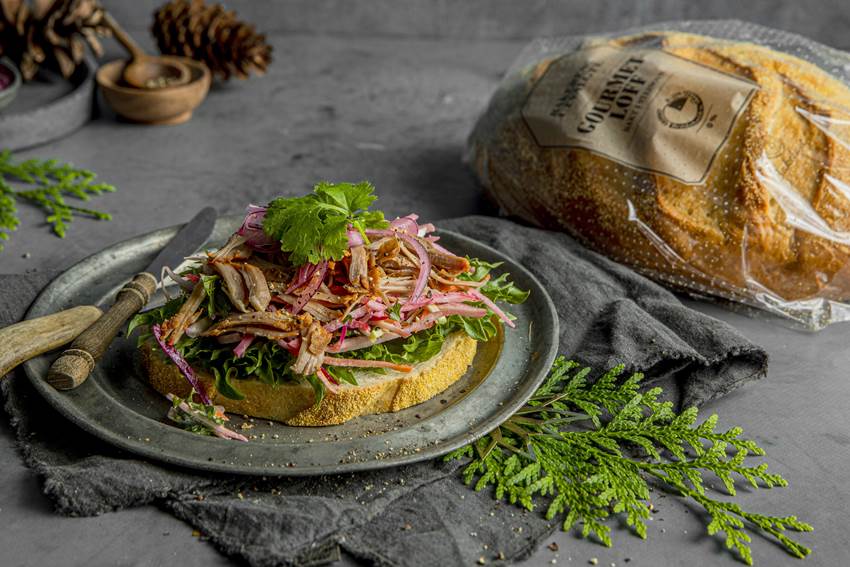 - Start med salat, fortsett med coleslaw og topp med strimlet ribbe og syltet løk.