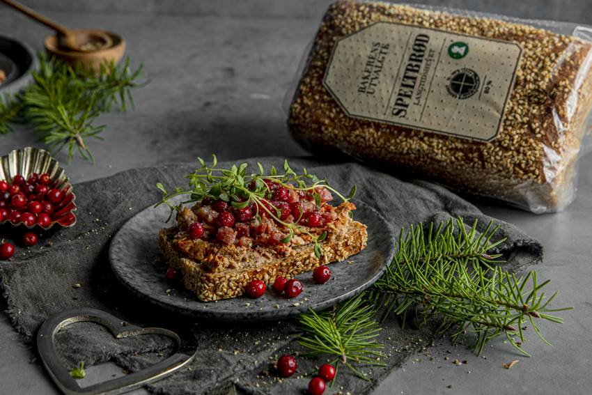 - Smør godt med leverpostei på skiven og topp med baconterninger, rørte tyttebær og timian.