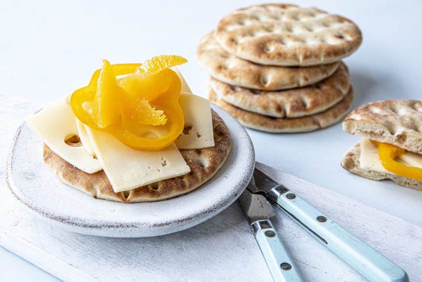 - Legg gode skiver Jarlsberg på Myk og rund Hveteskive og topp med sprø paprika og appelsinfileter.