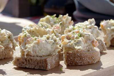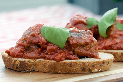 - Smør blandingen på en brødskive og topp med spekeskinke, egg og litt olivenolje