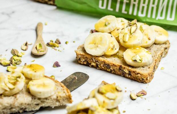 - Legg banan på brødskiven og dryss over grovhakkete pistasjnøtter.