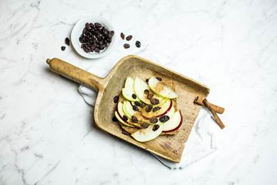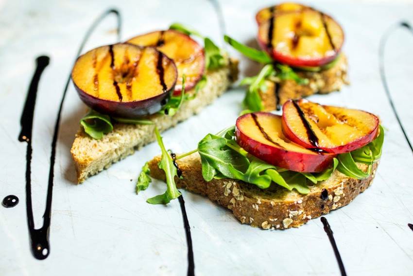 - Legg søte plommeskiver på en brødskive og topp med ruccula.