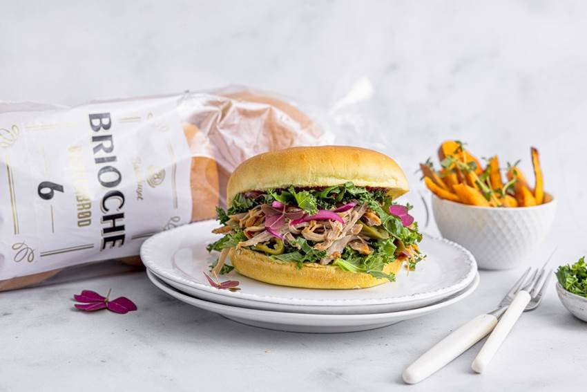 - Del briochebrødene i to. Start med grønnkål, fortsett med pulled pork og topp med syltet rødløk og jalapenos.